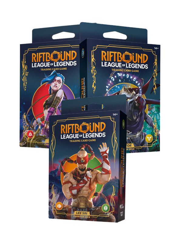 Losowa talia startowa dla Jinx, Viktor lub Lee Sin z Riftbound. W zestawie pudełko i papierowa mata. Brak boostera.